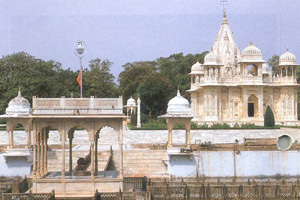 Mahal. The chattri of Madhao Rao Scindia faces his mother's chattri across the tank.